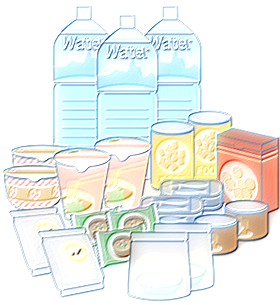 その他、レトルト食品、お米、パスタ、缶詰、インスタント食品など、長期保存のできるものも必要です。